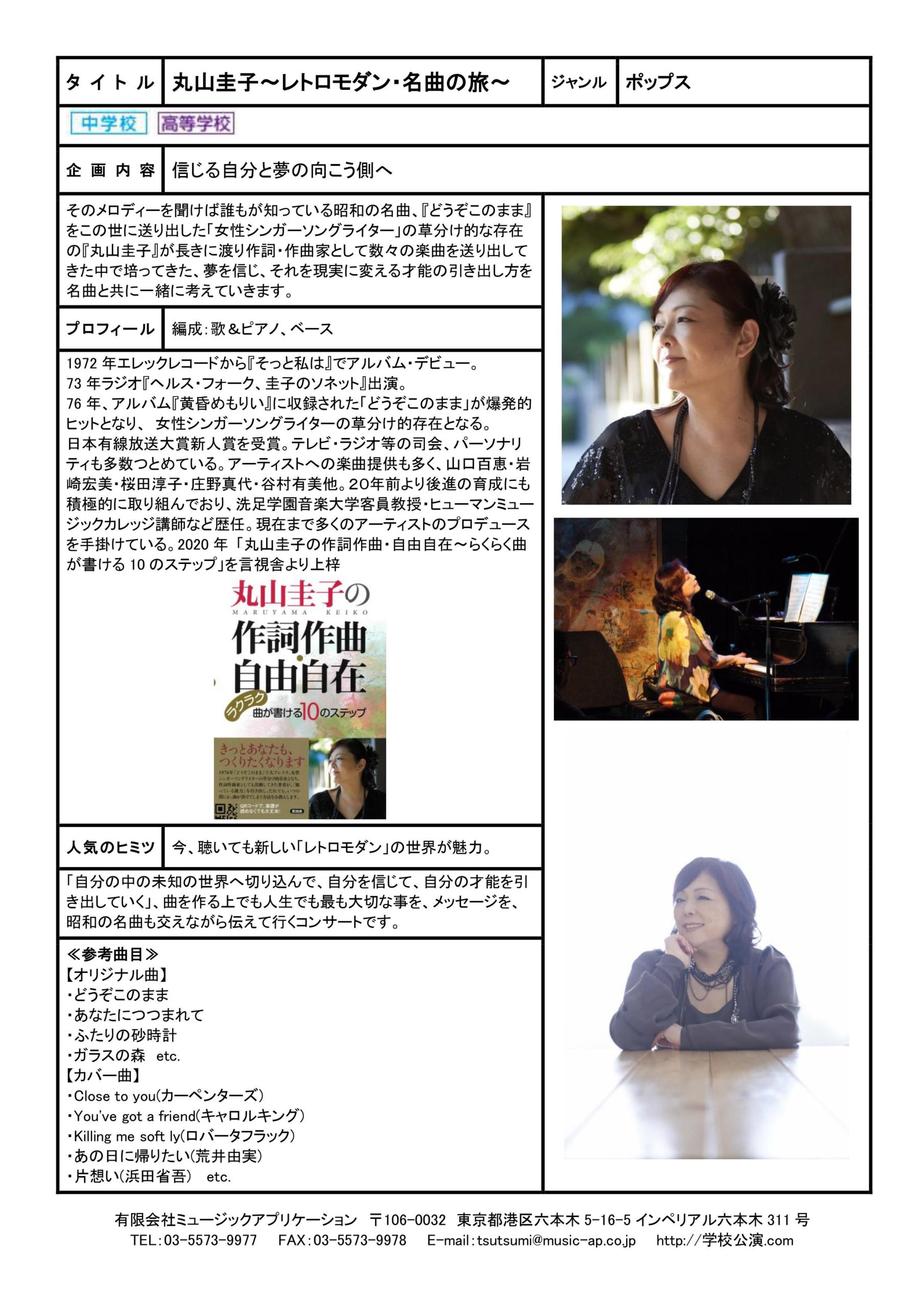 ホーム > TOPICS > 『丸山圭子』~レトロモダン・名曲の旅~ 学校公演用プログラムに新たに加わりました! 『丸山圭子』~レトロモダン・名曲の旅~ 学校公演用プログラムに新たに加わりました! そのメロディーを聞けば誰もが知っている昭和の名曲、『どうぞこのまま』をこの世に送り出した「女性シンガーソングライター」の草分け的な存在の『丸山圭子』が長きに渡り作詞・作曲家として数々の楽曲を送り出してきた中で培ってきた、夢を信じ、それを現実に変える才能の引き出し方を名曲と共に一緒に考えていきます。 ←前の記事 次の記事→